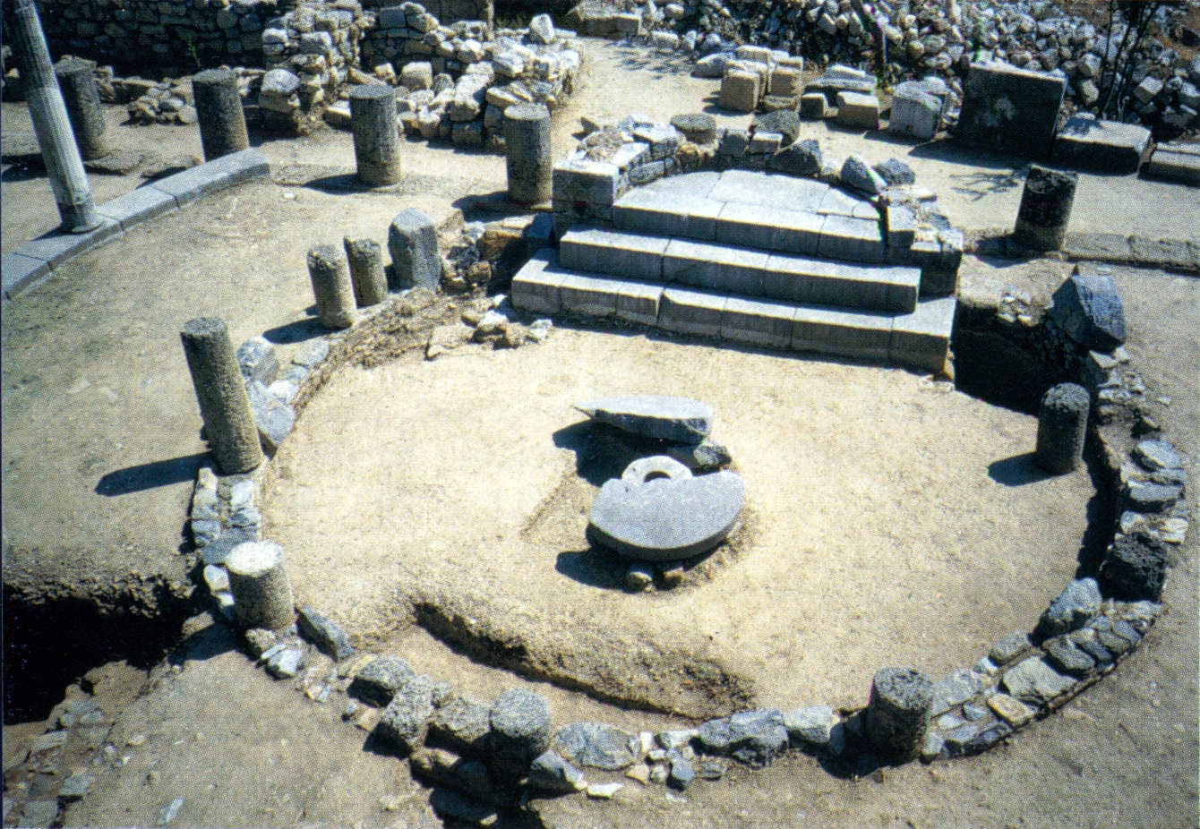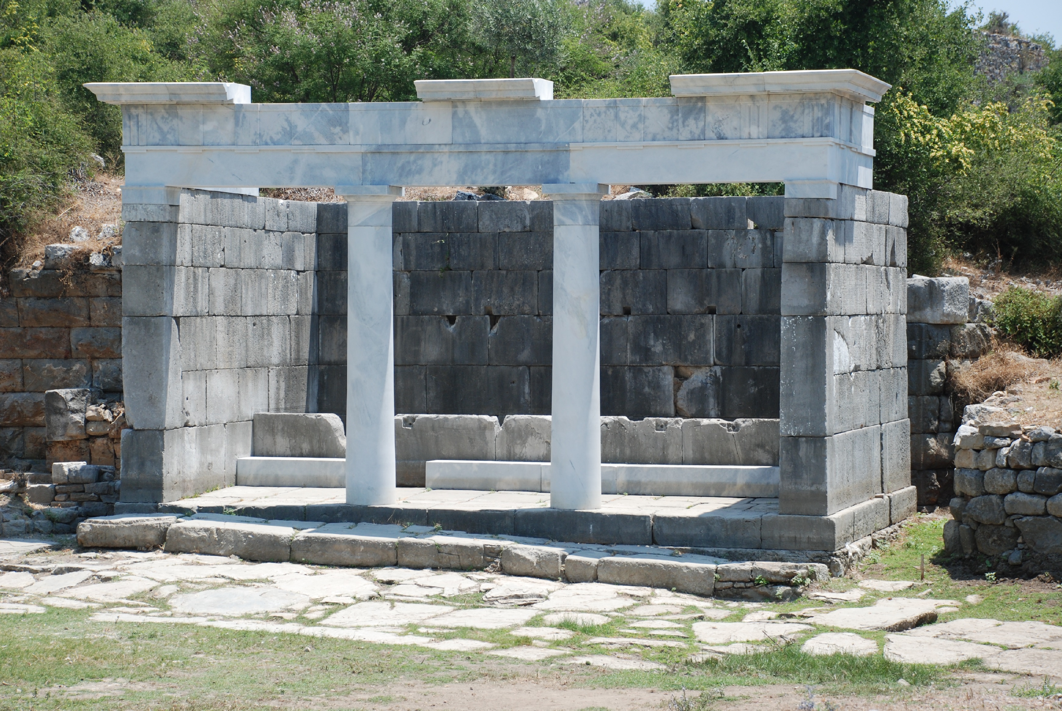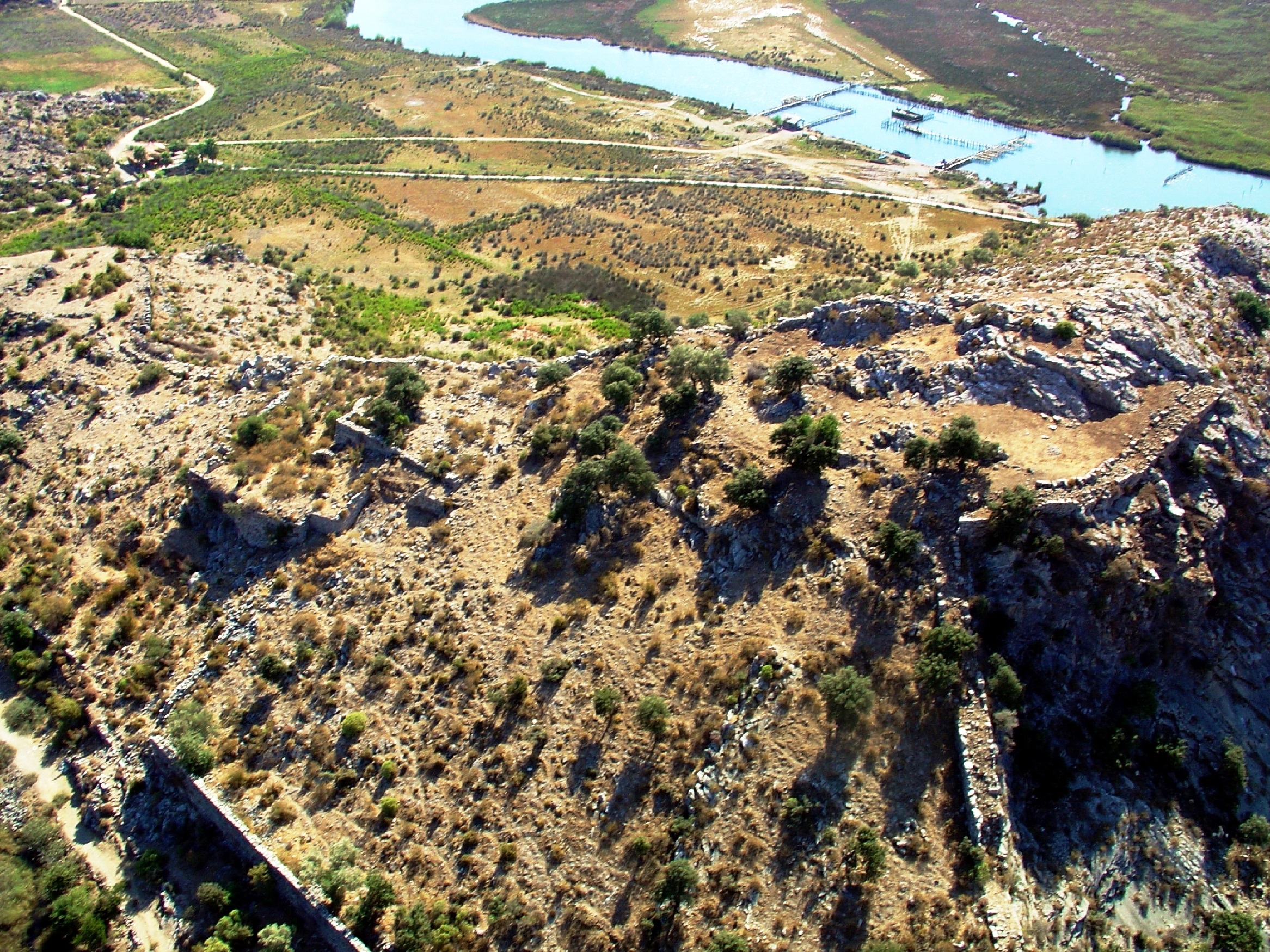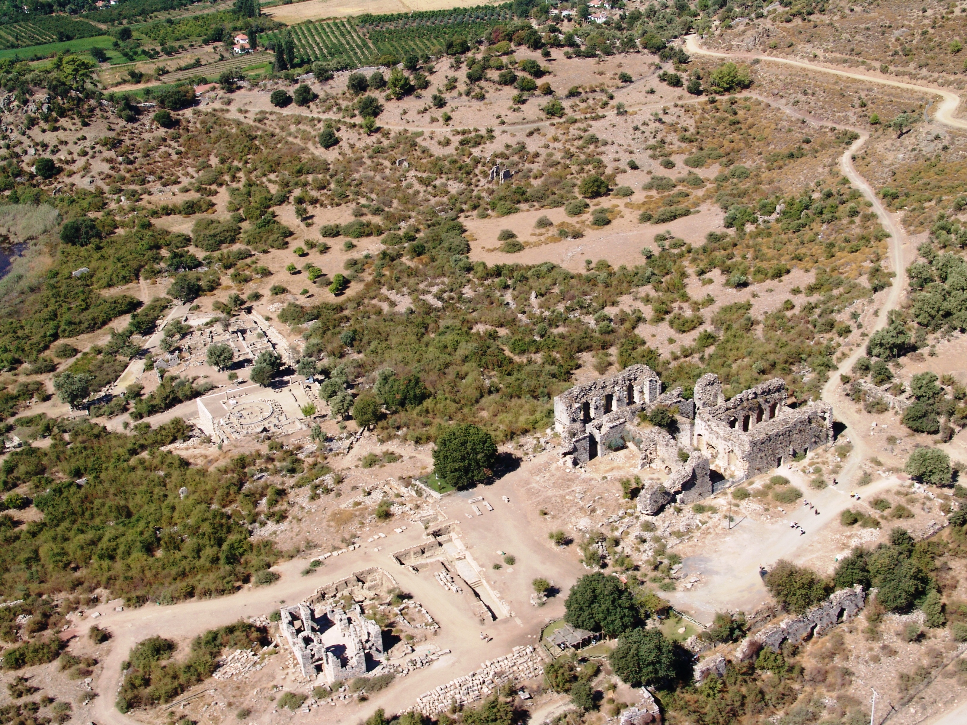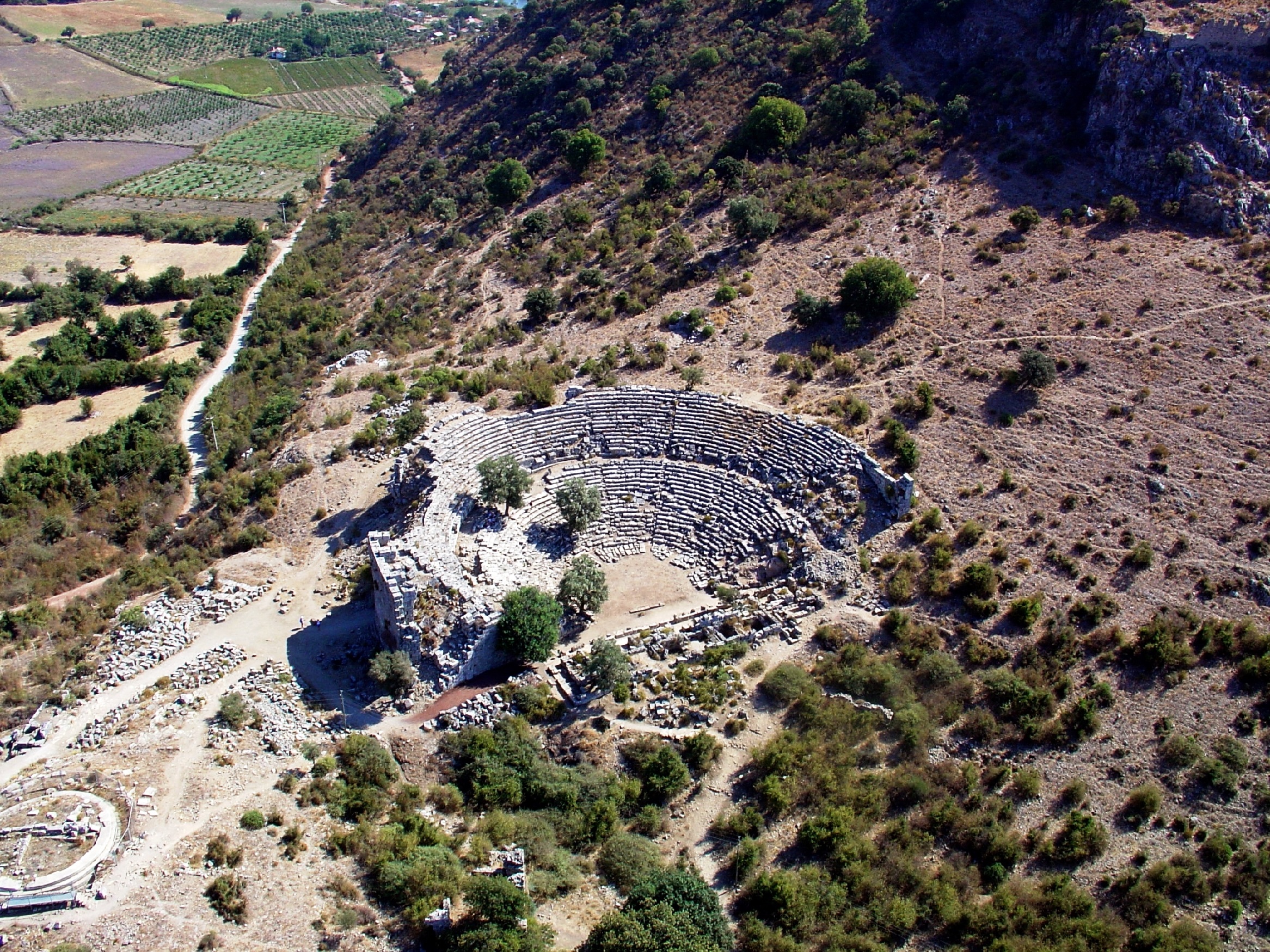 Akropolün eteğinde antik kentin tiyatrosu bulunuyor. Tiyatronun batı yönündeki yapı kalıntılarından biri bazilika tipi kiliseye ait, kentteki diğer kalıntıları ise Roma hamamı ve tapınaktan geri kalanlar oluşturuyor.
