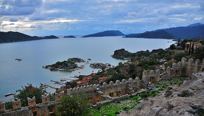 Kale'den Üçağız'a bakıldığında, buranın ne kadar emniyetli bir doğal liman olduğu görülür.